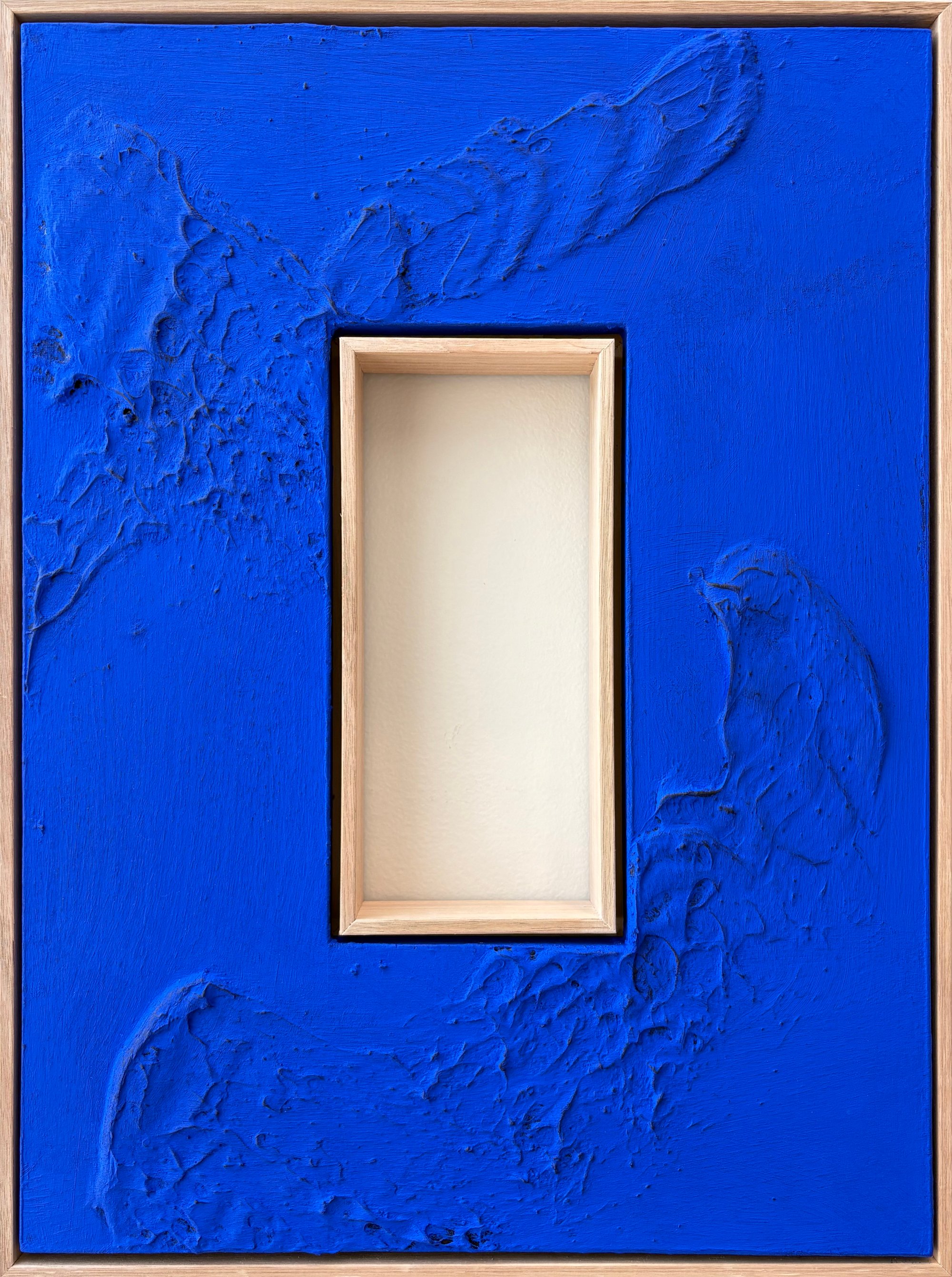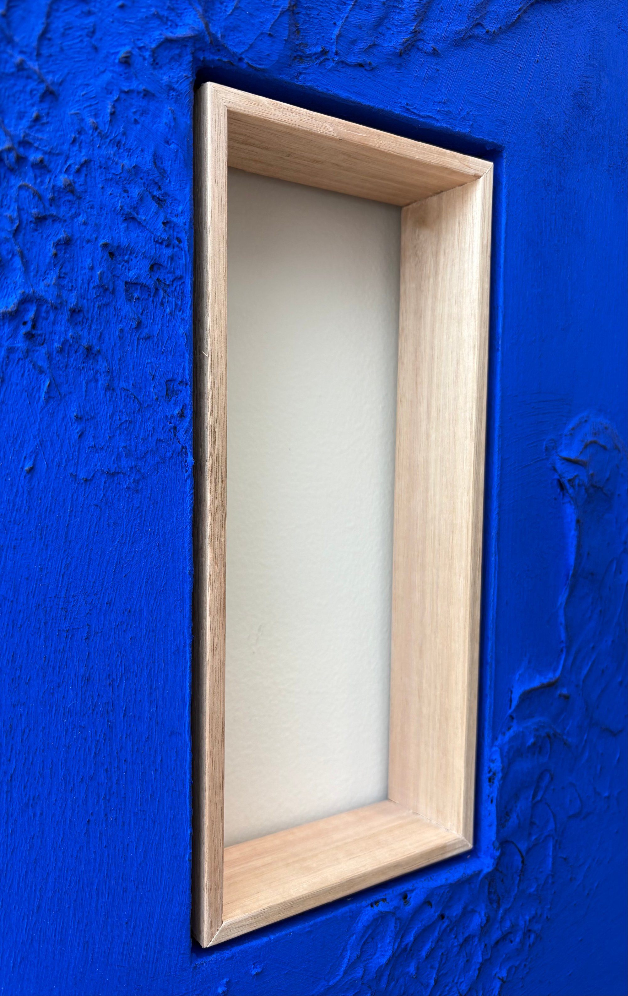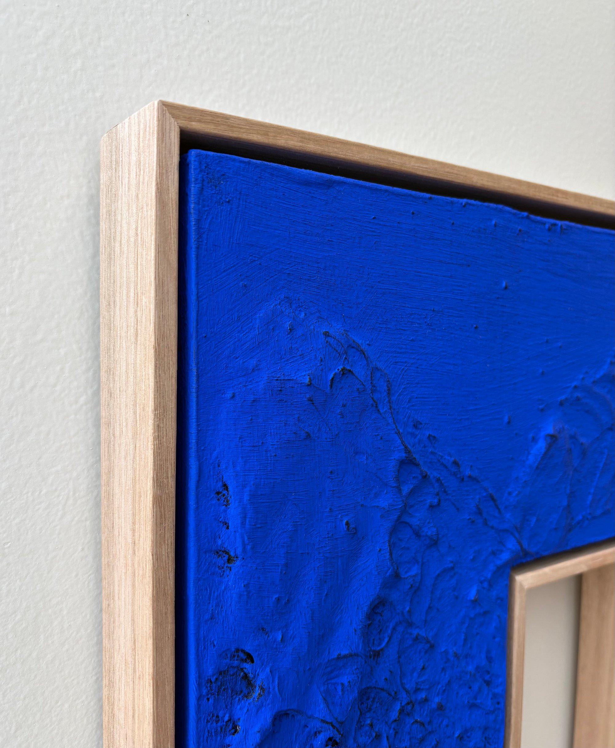 This unique and contemporary abstract painting breaks new ground with a captivating explosion of ultramarine blue and texture, inspired by the vast sea. The unconventional approach draws the viewer in, inviting exploration of the enigmatic composition. Signed discreetly on the back, the artwork encourages individual interpretation, making it engaging and thought-provoking. Framed in elegant oak, this creation leaves a lasting impression on anyone who beholds it.