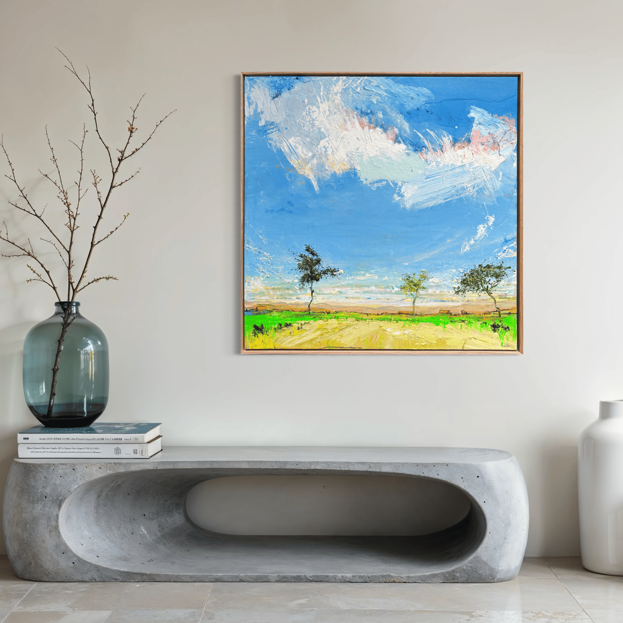 In this series, Charles explores a deep connection to the Australian landscape, drawn to three defining elements: expansive skies, vast land, and the enduring presence of gum trees. Working in a landscape impressionist style with bold, expressive colour, he captures the heat, light and atmosphere that shape the country’s character. The works speak to space and resilience — endless horizons, grounding terrain, and gum trees standing steadfast within it all.